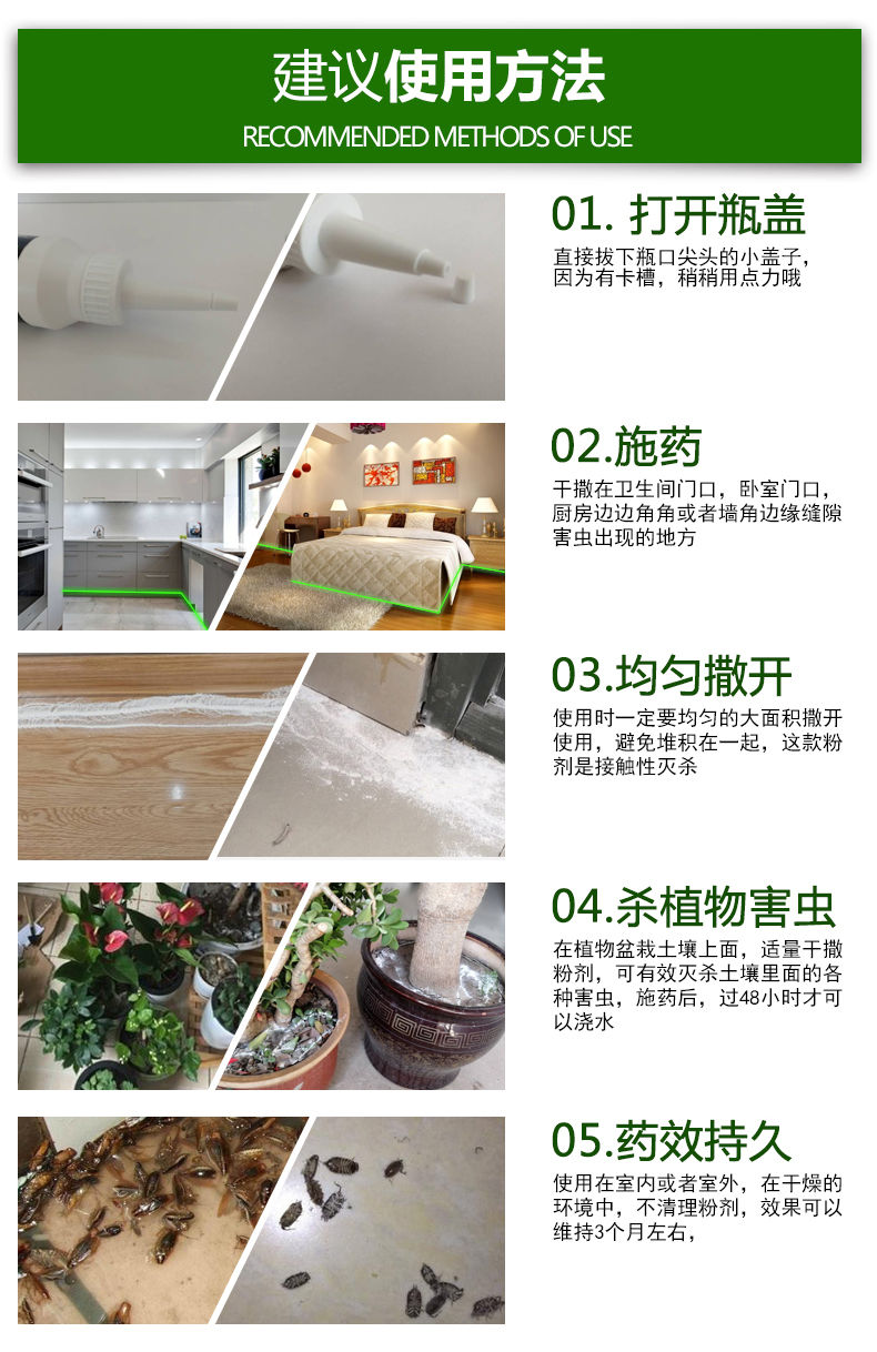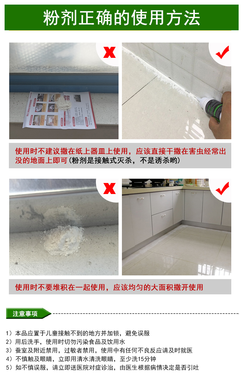打開小蓋子,將粉劑全面噴撒于地面、墻角、縫隙或害蟲喜棲和聚集的地方,對于有野貓、老鼠活動的區域要多噴撒一些,效果會更好。